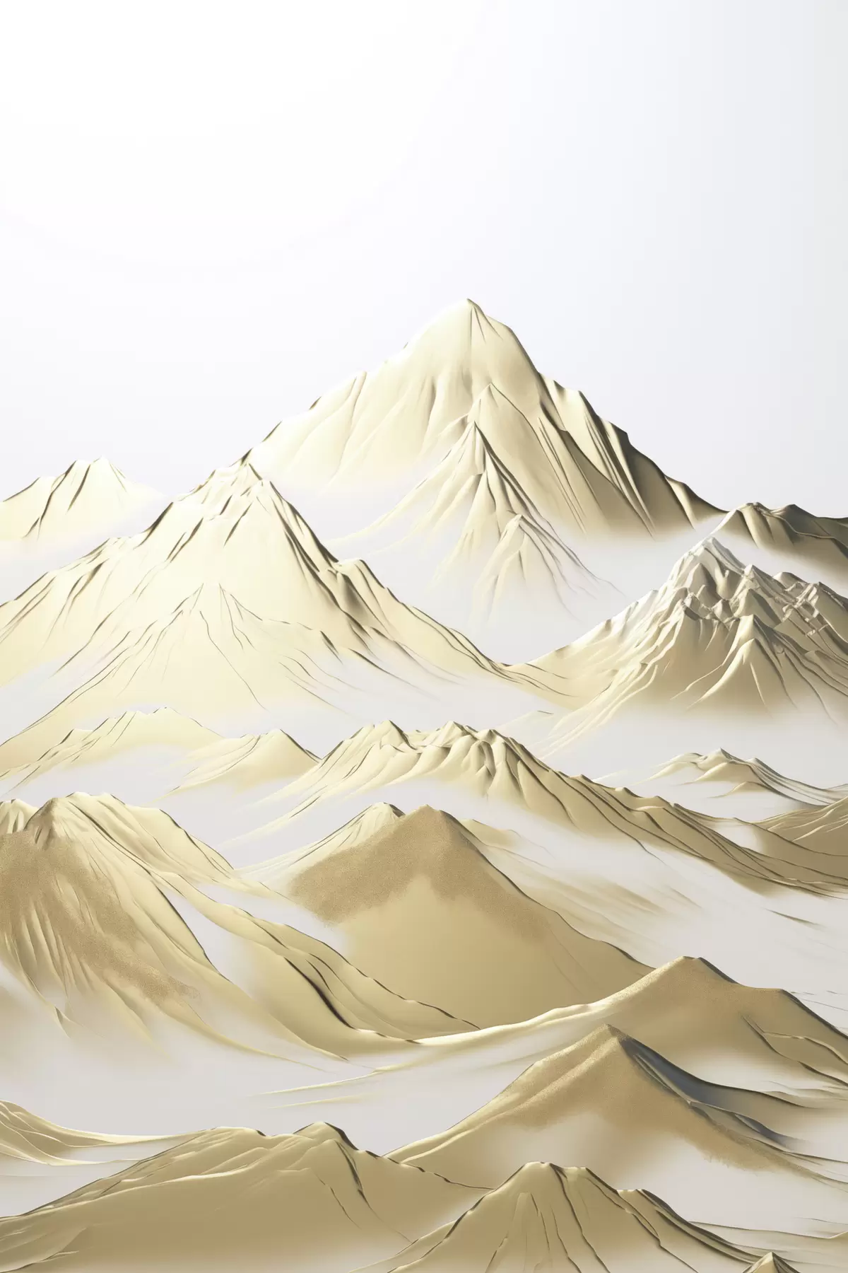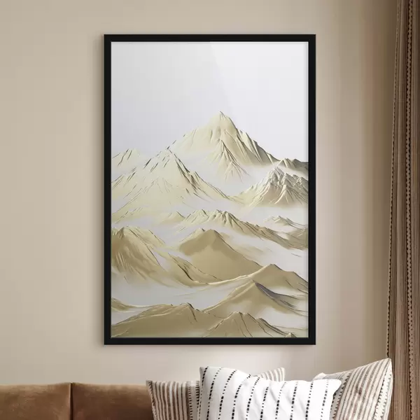 Poster Eine Landschaft aus gelben, schneebedeckten Bergen mit scharfen Gipfeln und tiefen Tälern unter einem hellen Himmel f47421