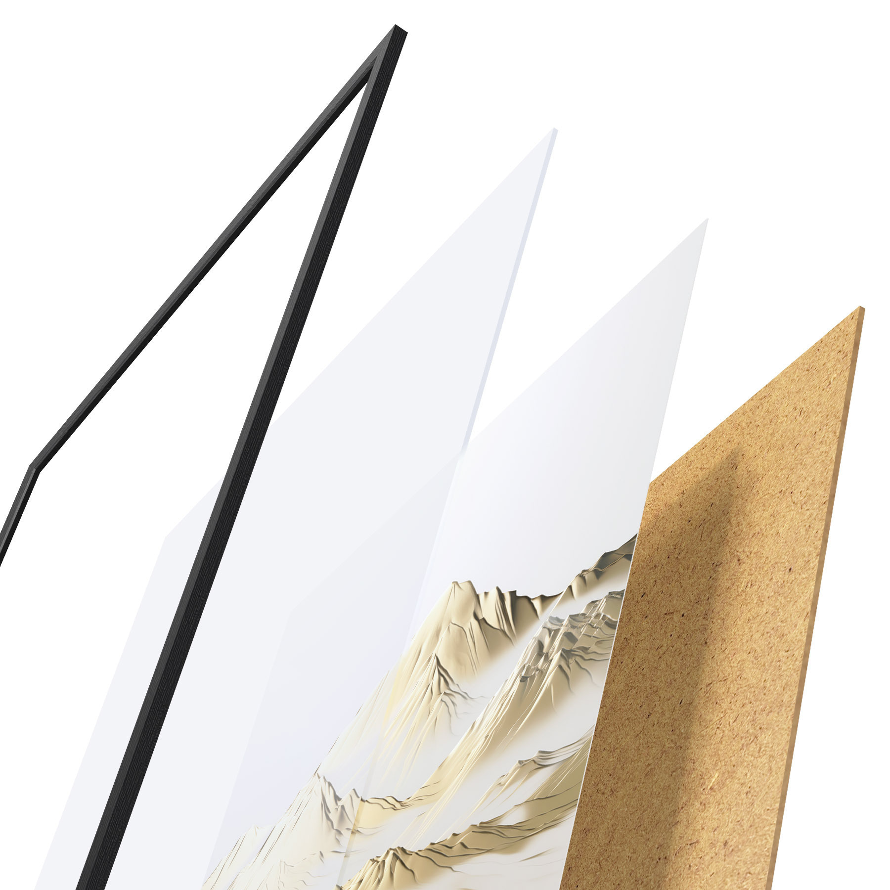 Das Poster besteht aus einem Rahmen, Plexiglas, einem gedruckten Bild und einer Rückwand aus Spanplatten. Dank der Halterungen auf der Rückseite kann das Poster sofort an die Wand gehängt werden.