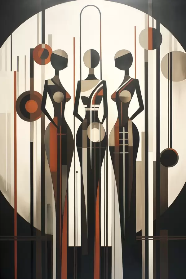 Poster Stilisierte weibliche Figuren mit geometrischen Elementen vor einem abstrakten Hintergrund aus vertikalen Linien und Kreisen Nr f47422