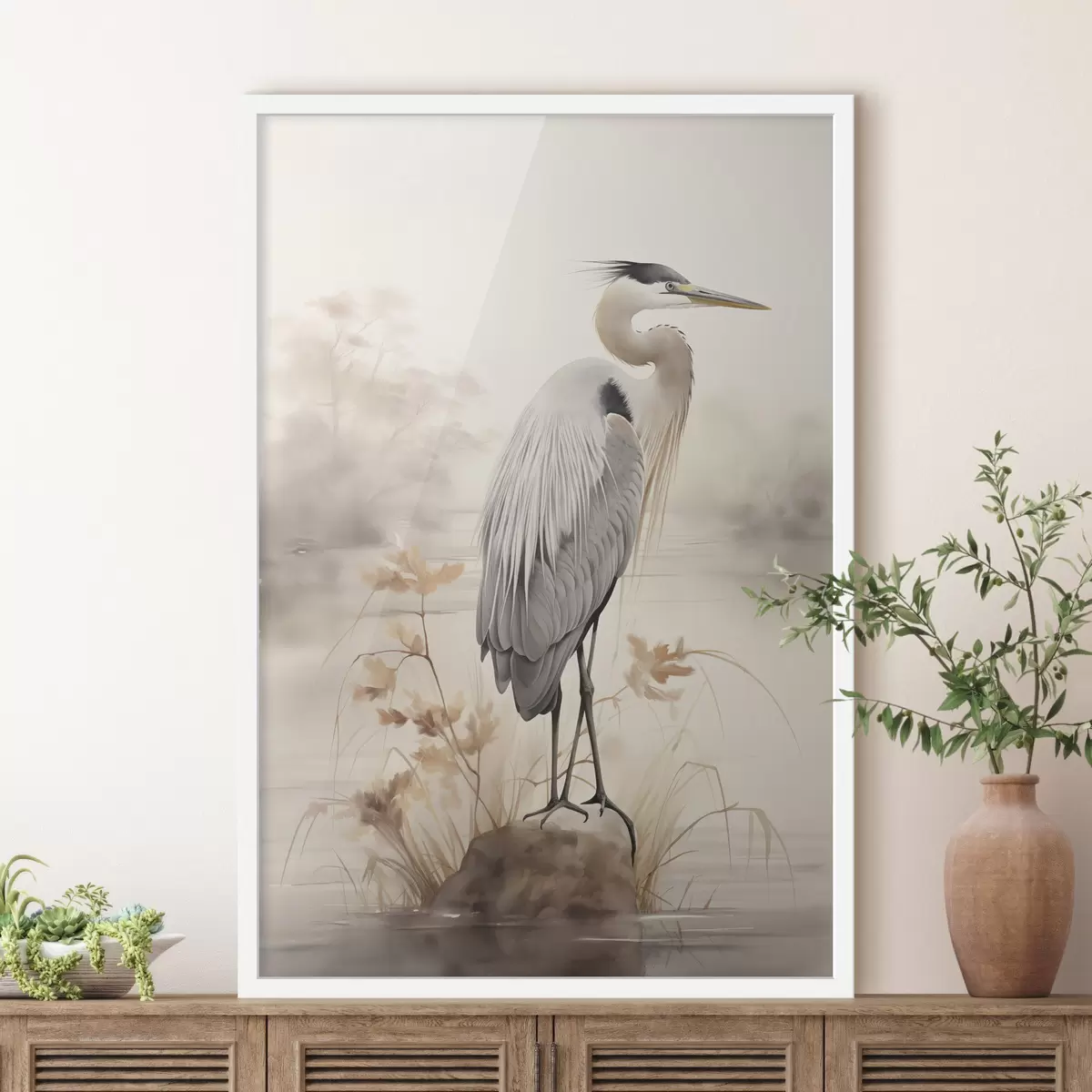 Poster Ein Reiher steht auf einem Felsen in einem See, im Hintergrund hohe Gräser und Bäume. f47426