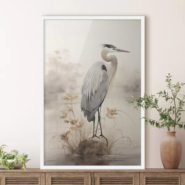 Poster Ein Reiher steht auf einem Felsen in einem See, im Hintergrund hohe Gräser und Bäume. Nr f47426
