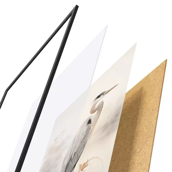 Das Poster besteht aus einem Rahmen, Plexiglas, einem gedruckten Bild und einer Rückwand aus Spanplatten. Dank der Halterungen auf der Rückseite kann das Poster sofort an die Wand gehängt werden.