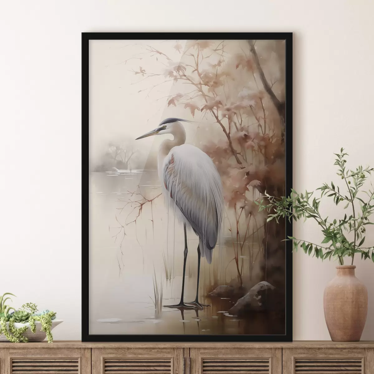 Poster Ein Reiher steht auf einem Felsen in einem See, im Hintergrund hohe Gräser und Bäume. Nr f47427