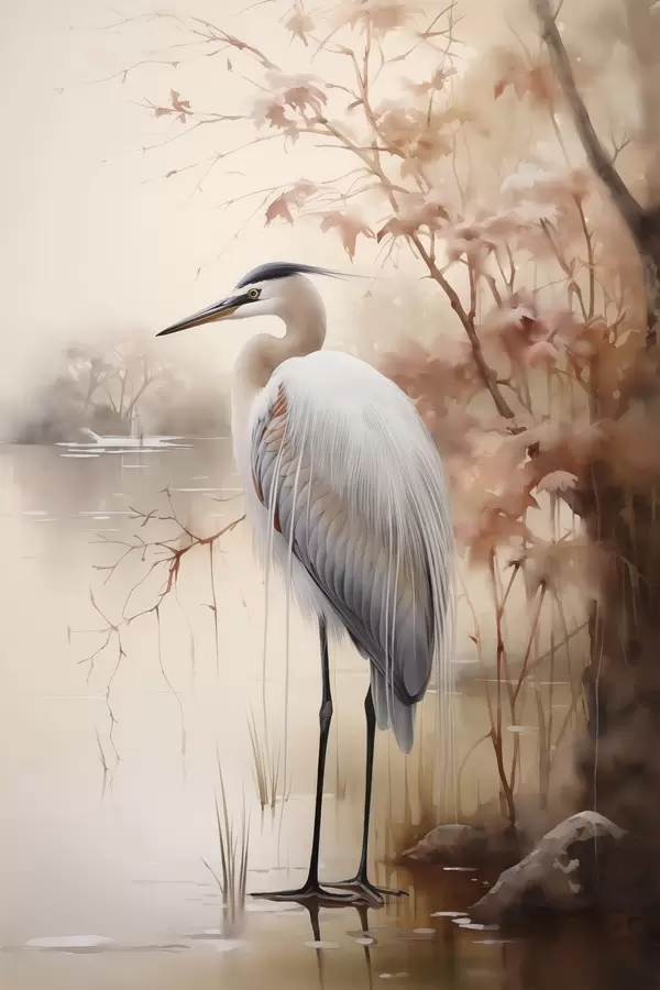 Poster Ein Reiher steht auf einem Felsen in einem See, im Hintergrund hohe Gräser und Bäume. Nr f47427