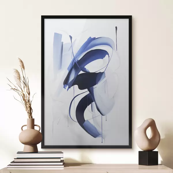 Poster Abstrakte blaue, pinselstrichartige Formen mit fließenden Linien und Kurven vor weißem Hintergrund, moderne Kunst Nr f47428
