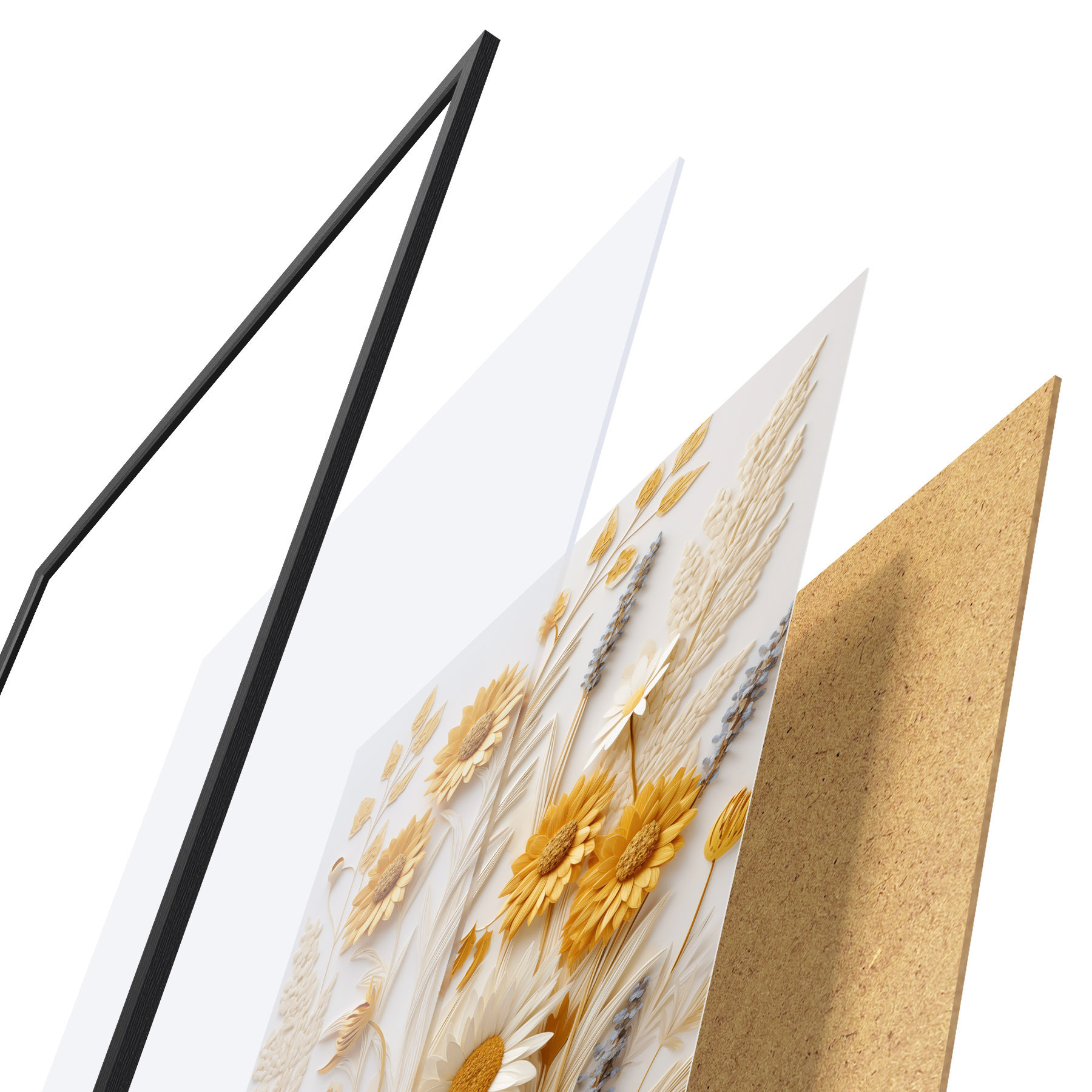 Das Poster besteht aus einem Rahmen, Plexiglas, einem gedruckten Bild und einer Rückwand aus Spanplatten. Dank der Halterungen auf der Rückseite kann das Poster sofort an die Wand gehängt werden.