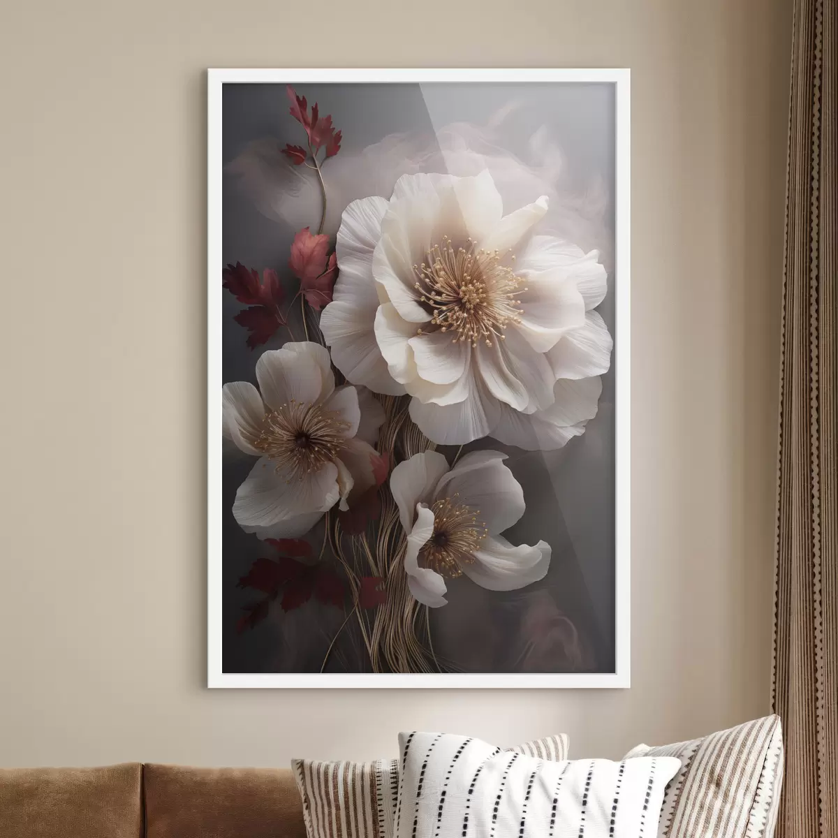 Poster Zarte Pfingstrosen mit dünnen, zarten Blütenblättern, umgeben von dunkelroten Blättern vor einem abstrakten Hintergrund Nr f47434