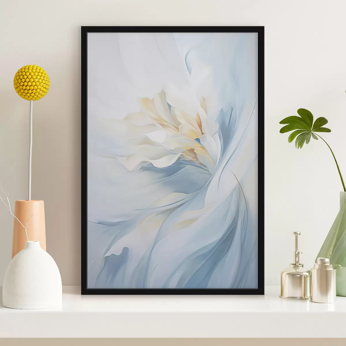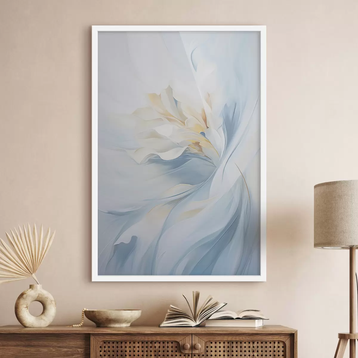 Poster Abstrakte, zarte, durchscheinende Blütenblätter, die sich bei sanfter Beleuchtung und einer malerischen Textur nach innen drehen. Nr f47436