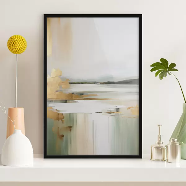 Poster Abstrakte Landschaft mit Gelb- und Grüntönen, Wasser, das den Himmel und entfernte Berge reflektiert, blasser, dunstiger Himmel Nr f47438