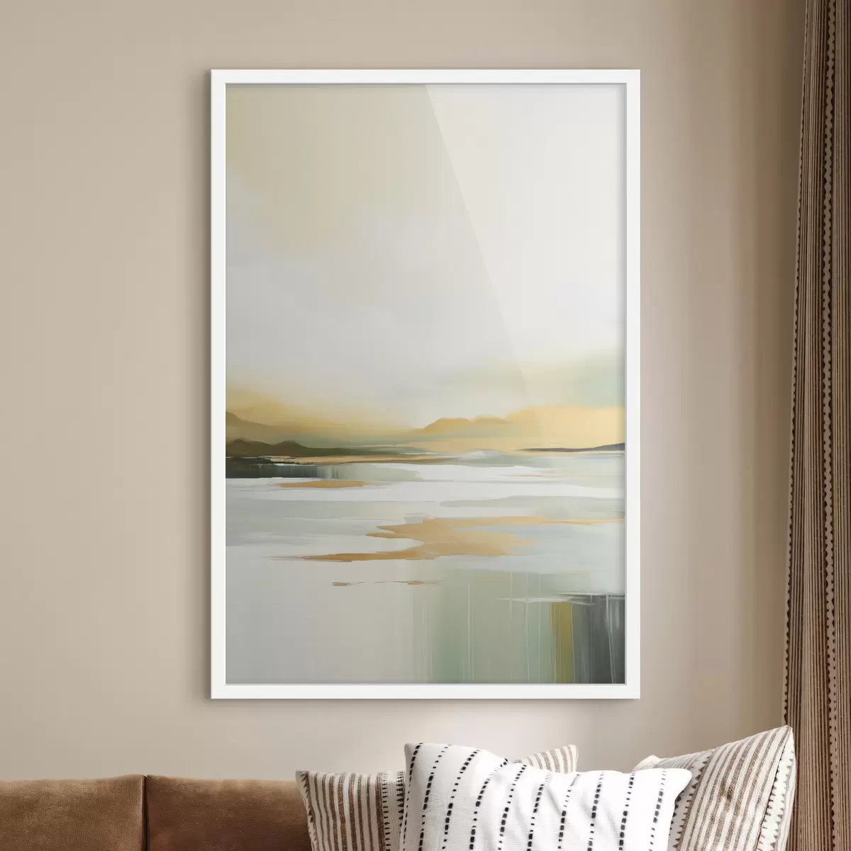 Poster Abstrakte Landschaft mit Gelb- und Grüntönen, Wasser, das den Himmel und entfernte Berge reflektiert, blasser, dunstiger Himmel Nr f47439