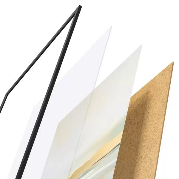 Das Poster besteht aus einem Rahmen, Plexiglas, einem gedruckten Bild und einer Rückwand aus Spanplatten. Dank der Halterungen auf der Rückseite kann das Poster sofort an die Wand gehängt werden.
