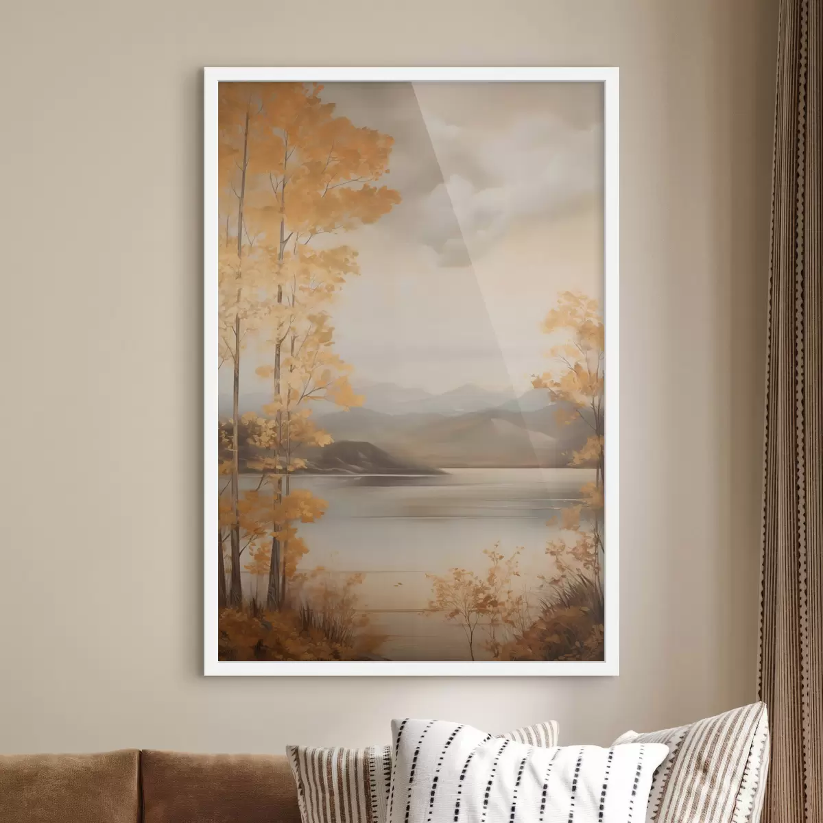 Poster Herbstliche Bäume mit orangefarbenen Blättern umrahmen einen ruhigen See mit fernen Bergen unter einem bewölkten Himmel. f47441