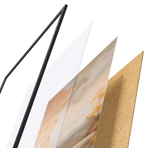 Das Poster besteht aus einem Rahmen, Plexiglas, einem gedruckten Bild und einer Rückwand aus Spanplatten. Dank der Halterungen auf der Rückseite kann das Poster sofort an die Wand gehängt werden.