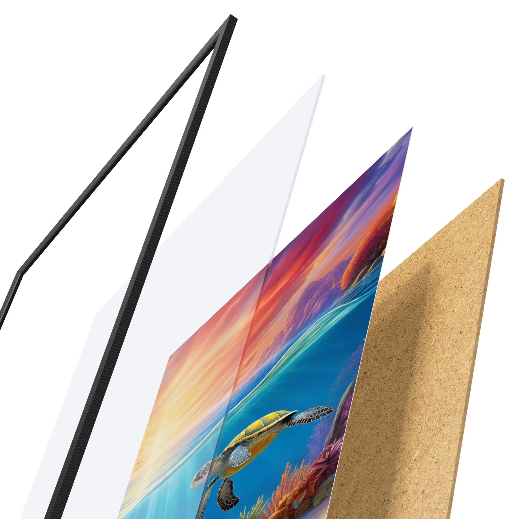 Das Poster besteht aus einem Rahmen, Plexiglas, einem gedruckten Bild und einer Rückwand aus Spanplatten. Dank der Halterungen auf der Rückseite kann das Poster sofort an die Wand gehängt werden.