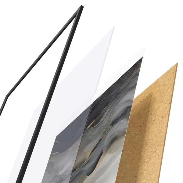 Das Poster besteht aus einem Rahmen, Plexiglas, einem gedruckten Bild und einer Rückwand aus Spanplatten. Dank der Halterungen auf der Rückseite kann das Poster sofort an die Wand gehängt werden.