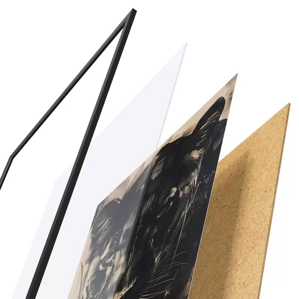Das Poster besteht aus einem Rahmen, Plexiglas, einem gedruckten Bild und einer Rückwand aus Spanplatten. Dank der Halterungen auf der Rückseite kann das Poster sofort an die Wand gehängt werden.