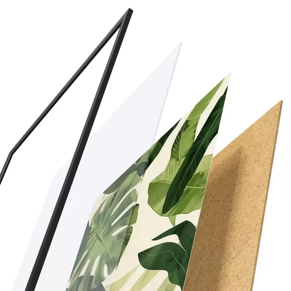 Das Poster besteht aus einem Rahmen, Plexiglas, einem gedruckten Bild und einer Rückwand aus Spanplatten. Dank der Halterungen auf der Rückseite kann das Poster sofort an die Wand gehängt werden.