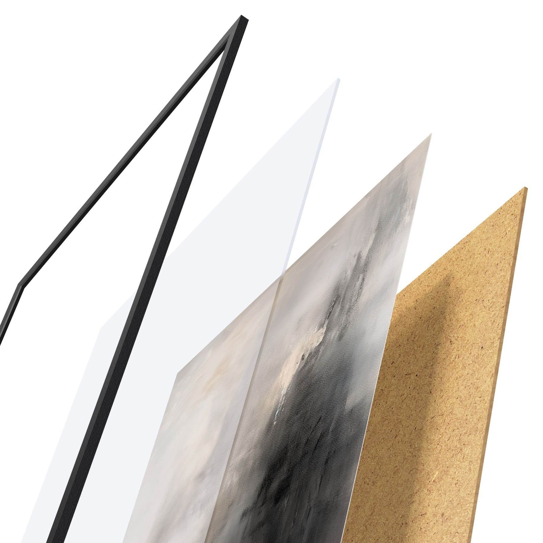 Das Poster besteht aus einem Rahmen, Plexiglas, einem gedruckten Bild und einer Rückwand aus Spanplatten. Dank der Halterungen auf der Rückseite kann das Poster sofort an die Wand gehängt werden.