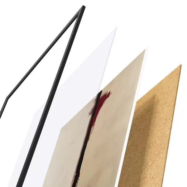 Das Poster besteht aus einem Rahmen, Plexiglas, einem gedruckten Bild und einer Rückwand aus Spanplatten. Dank der Halterungen auf der Rückseite kann das Poster sofort an die Wand gehängt werden.