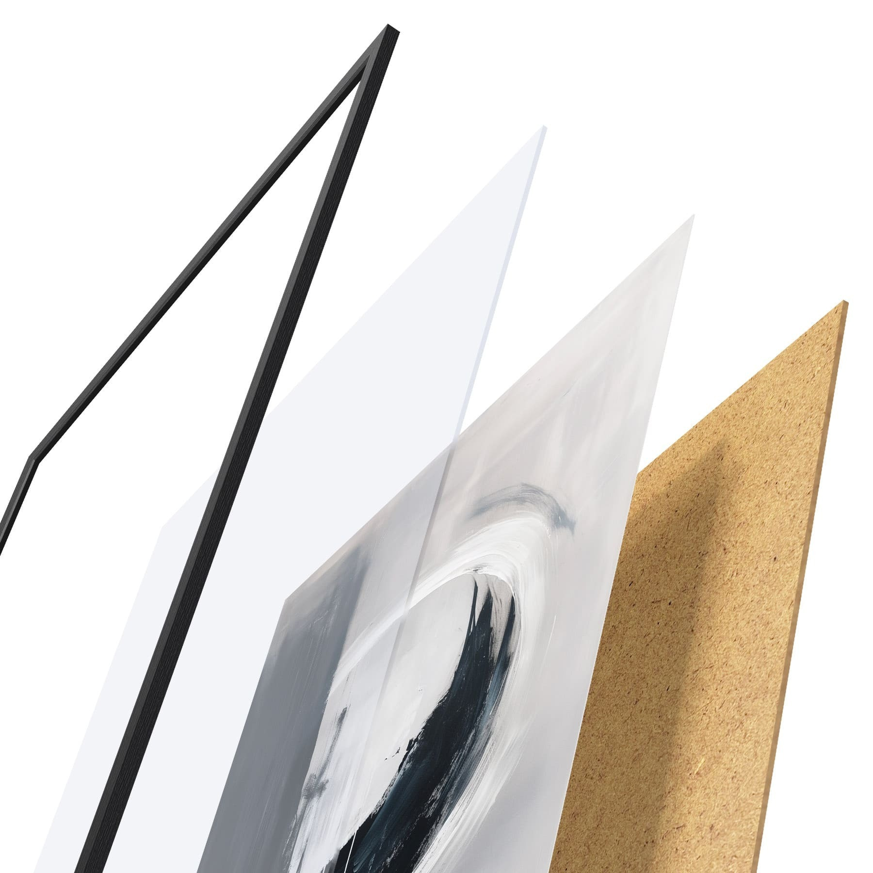 Das Poster besteht aus einem Rahmen, Plexiglas, einem gedruckten Bild und einer Rückwand aus Spanplatten. Dank der Halterungen auf der Rückseite kann das Poster sofort an die Wand gehängt werden.