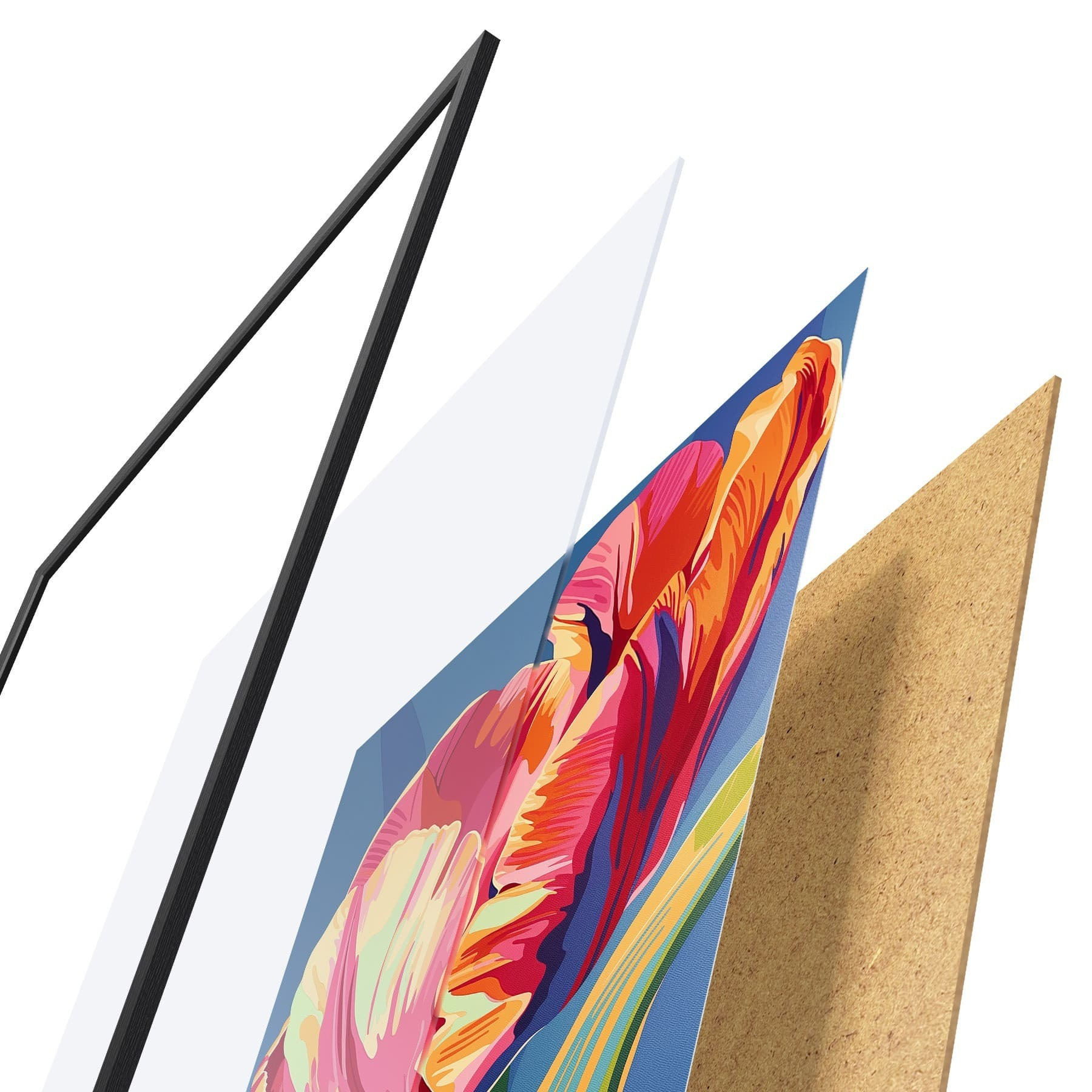 Das Poster besteht aus einem Rahmen, Plexiglas, einem gedruckten Bild und einer Rückwand aus Spanplatten. Dank der Halterungen auf der Rückseite kann das Poster sofort an die Wand gehängt werden.