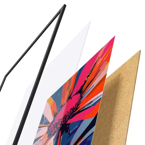 Das Poster besteht aus einem Rahmen, Plexiglas, einem gedruckten Bild und einer Rückwand aus Spanplatten. Dank der Halterungen auf der Rückseite kann das Poster sofort an die Wand gehängt werden.