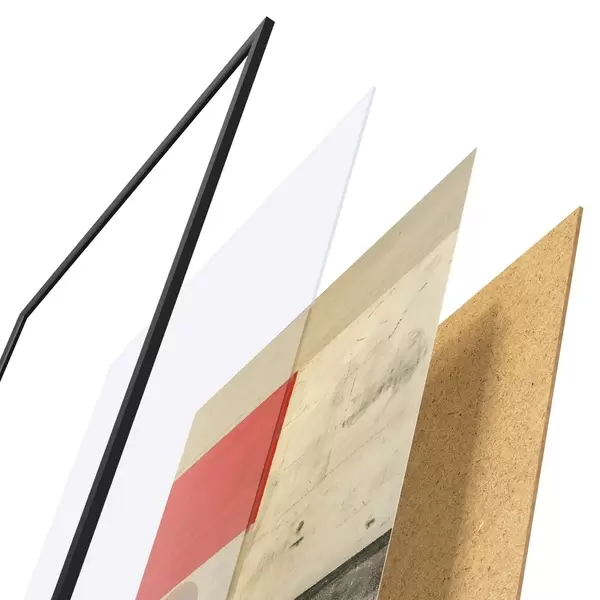 Das Poster besteht aus einem Rahmen, Plexiglas, einem gedruckten Bild und einer Rückwand aus Spanplatten. Dank der Halterungen auf der Rückseite kann das Poster sofort an die Wand gehängt werden.