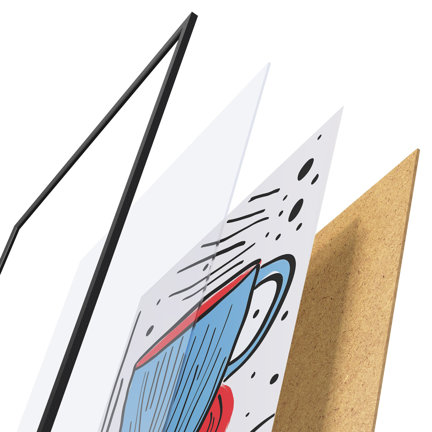 Das Poster besteht aus einem Rahmen, Plexiglas, einem gedruckten Bild und einer Rückwand aus Spanplatten. Dank der Halterungen auf der Rückseite kann das Poster sofort an die Wand gehängt werden.