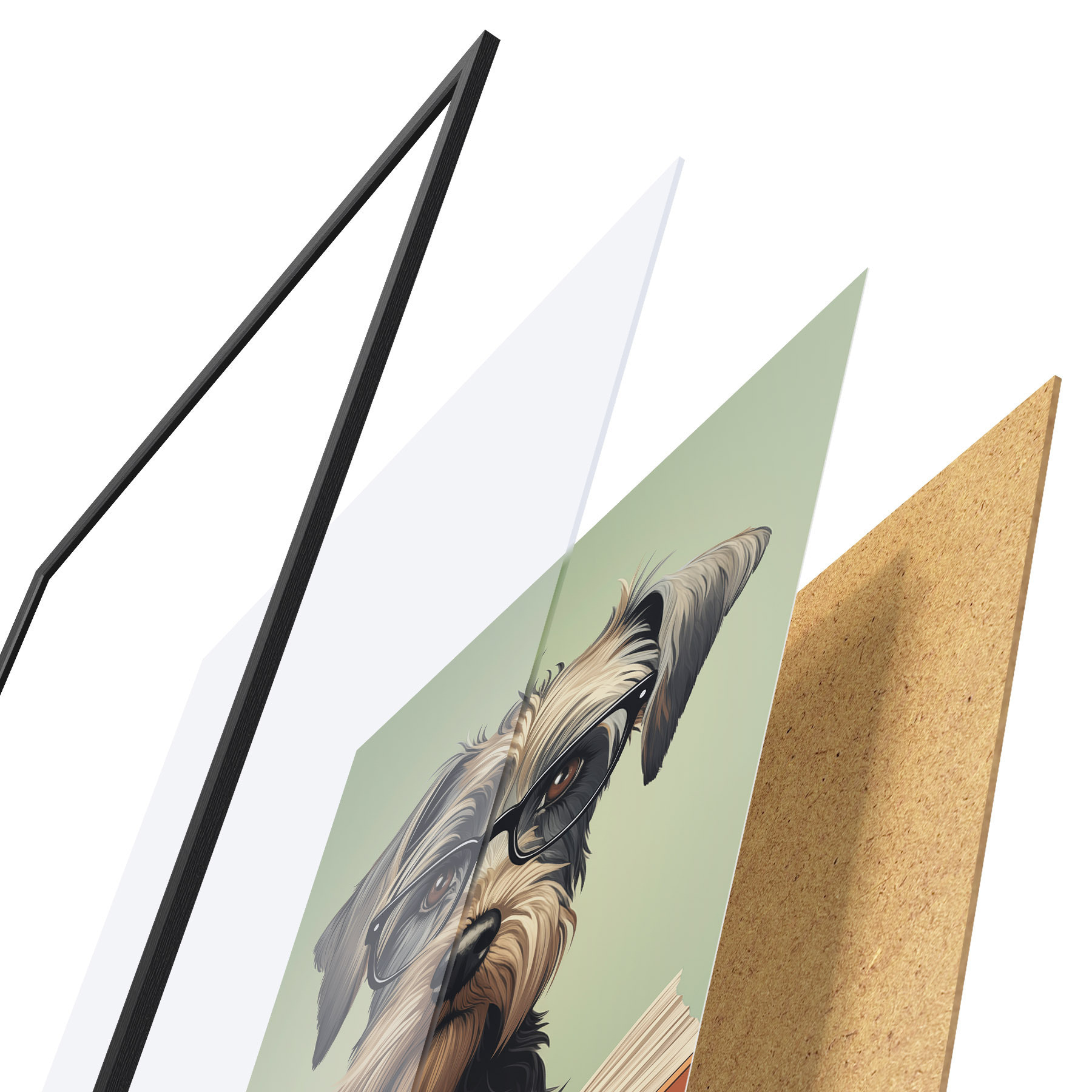 Das Poster besteht aus einem Rahmen, Plexiglas, einem gedruckten Bild und einer Rückwand aus Spanplatten. Dank der Halterungen auf der Rückseite kann das Poster sofort an die Wand gehängt werden.
