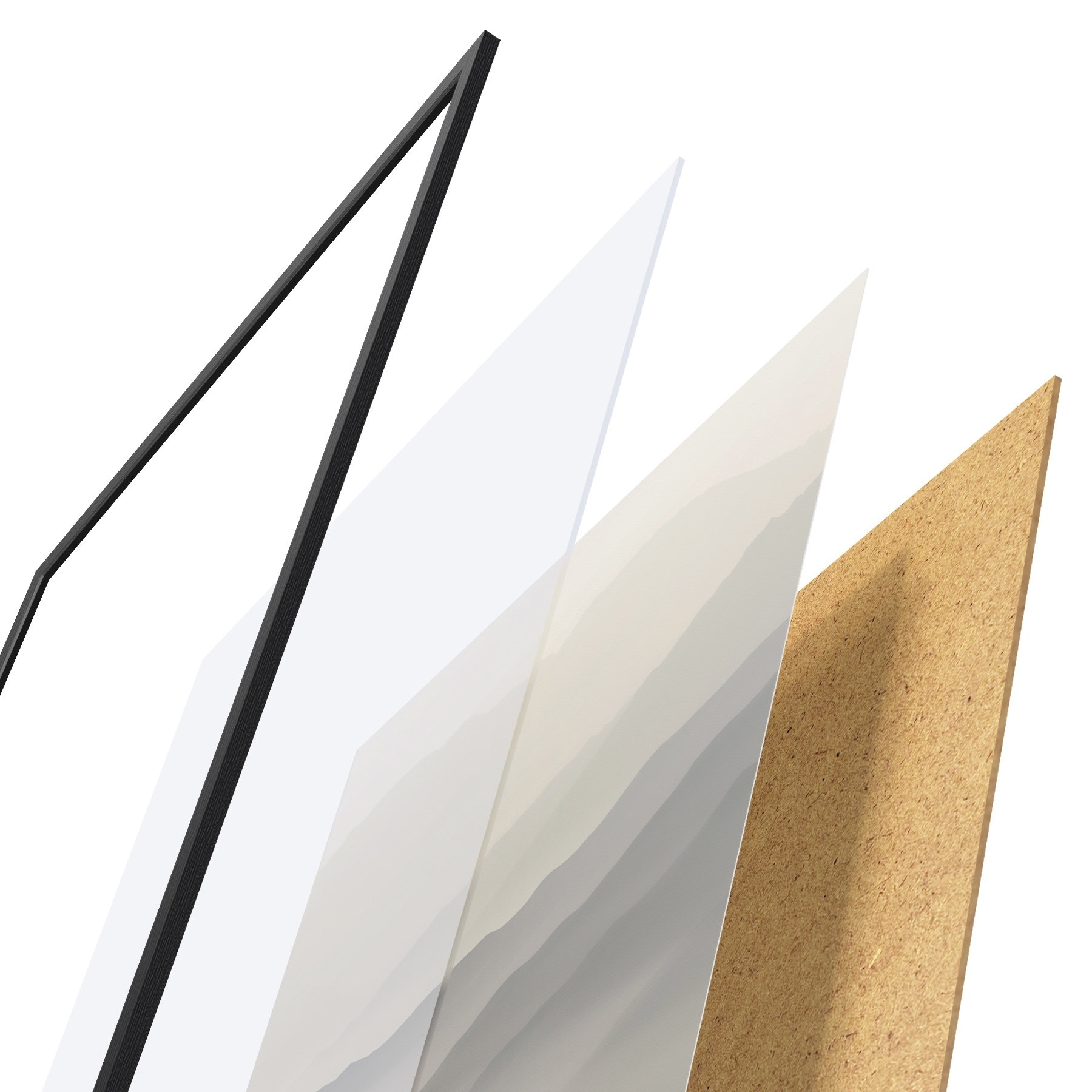 Das Poster besteht aus einem Rahmen, Plexiglas, einem gedruckten Bild und einer Rückwand aus Spanplatten. Dank der Halterungen auf der Rückseite kann das Poster sofort an die Wand gehängt werden.