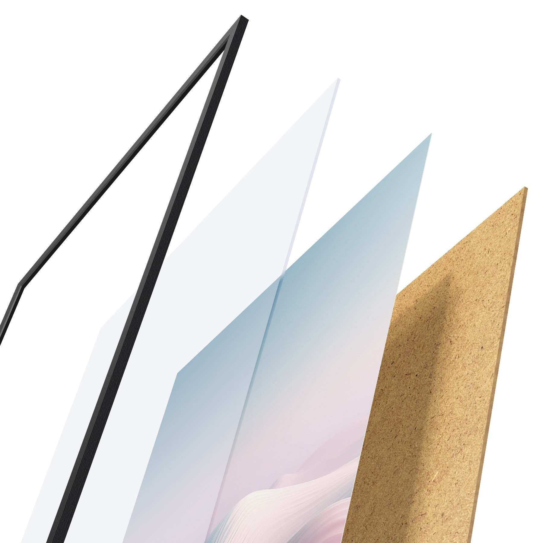 Das Poster besteht aus einem Rahmen, Plexiglas, einem gedruckten Bild und einer Rückwand aus Spanplatten. Dank der Halterungen auf der Rückseite kann das Poster sofort an die Wand gehängt werden.