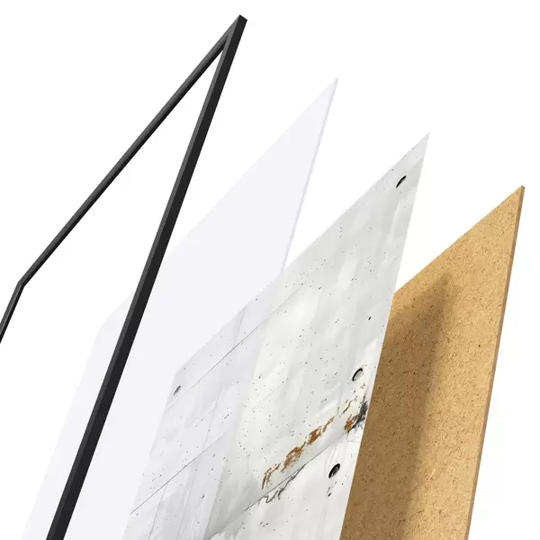 Das Poster besteht aus einem Rahmen, Plexiglas, einem gedruckten Bild und einer Rückwand aus Spanplatten. Dank der Halterungen auf der Rückseite kann das Poster sofort an die Wand gehängt werden.