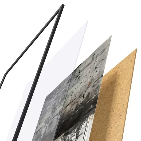 Das Poster besteht aus einem Rahmen, Plexiglas, einem gedruckten Bild und einer Rückwand aus Spanplatten. Dank der Halterungen auf der Rückseite kann das Poster sofort an die Wand gehängt werden.