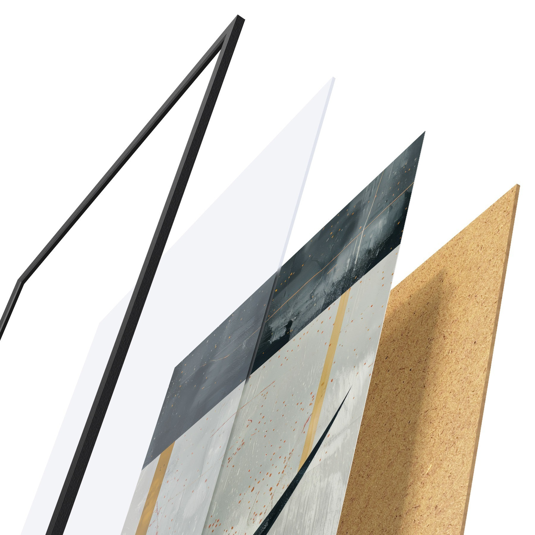 Das Poster besteht aus einem Rahmen, Plexiglas, einem gedruckten Bild und einer Rückwand aus Spanplatten. Dank der Halterungen auf der Rückseite kann das Poster sofort an die Wand gehängt werden.