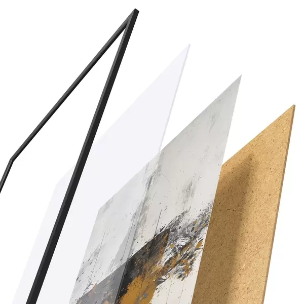 Das Poster besteht aus einem Rahmen, Plexiglas, einem gedruckten Bild und einer Rückwand aus Spanplatten. Dank der Halterungen auf der Rückseite kann das Poster sofort an die Wand gehängt werden.