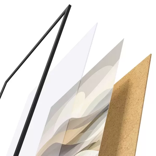 Das Poster besteht aus einem Rahmen, Plexiglas, einem gedruckten Bild und einer Rückwand aus Spanplatten. Dank der Halterungen auf der Rückseite kann das Poster sofort an die Wand gehängt werden.