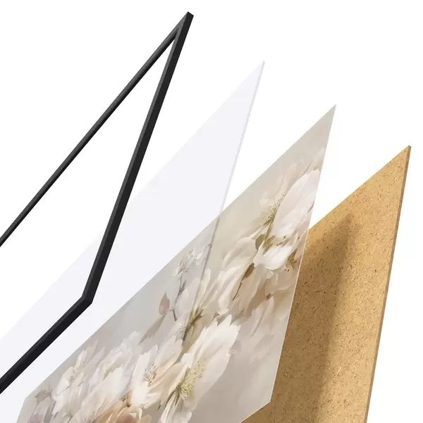 Das Poster besteht aus einem Rahmen, Plexiglas, einem gedruckten Bild und einer Rückwand aus Spanplatten. Dank der Halterungen auf der Rückseite kann das Poster sofort an die Wand gehängt werden.
