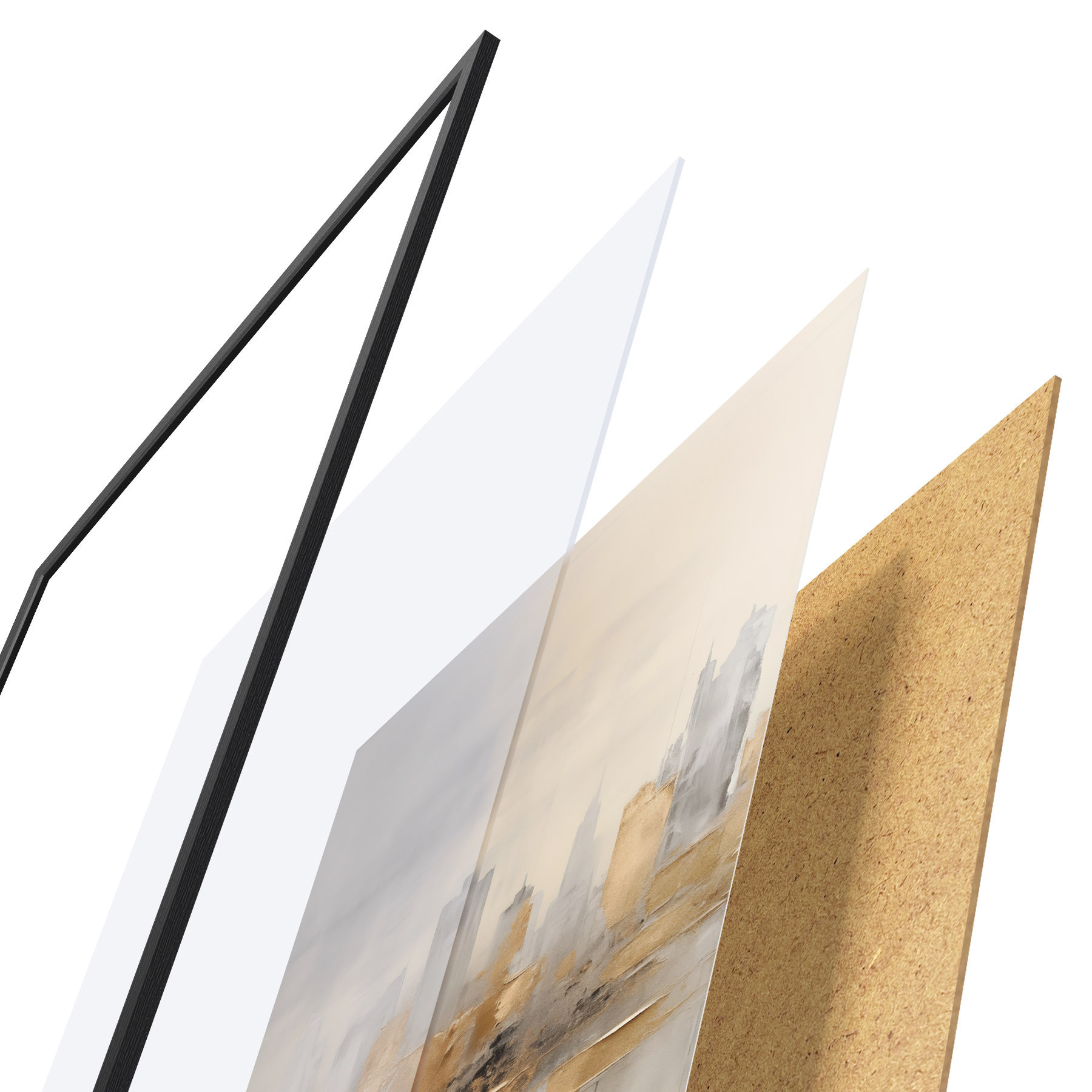 Das Poster besteht aus einem Rahmen, Plexiglas, einem gedruckten Bild und einer Rückwand aus Spanplatten. Dank der Halterungen auf der Rückseite kann das Poster sofort an die Wand gehängt werden.