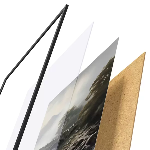 Das Poster besteht aus einem Rahmen, Plexiglas, einem gedruckten Bild und einer Rückwand aus Spanplatten. Dank der Halterungen auf der Rückseite kann das Poster sofort an die Wand gehängt werden.