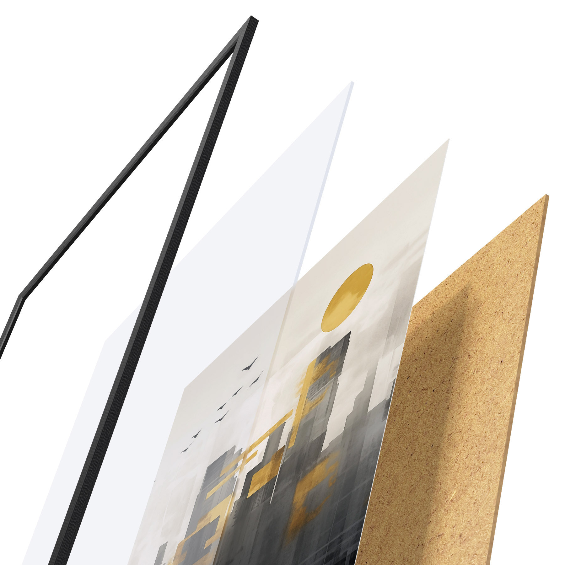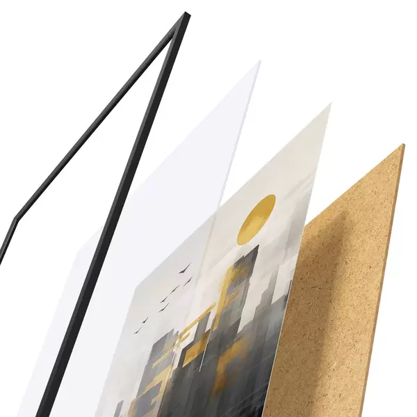Das Poster besteht aus einem Rahmen, Plexiglas, einem gedruckten Bild und einer Rückwand aus Spanplatten. Dank der Halterungen auf der Rückseite kann das Poster sofort an die Wand gehängt werden.