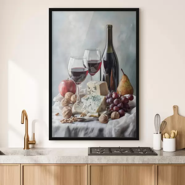 Poster Stillleben mit Wein, Käse und Nüssen f47686