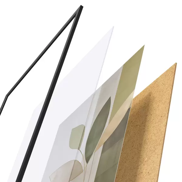 Das Poster besteht aus einem Rahmen, Plexiglas, einem gedruckten Bild und einer Rückwand aus Spanplatten. Dank der Halterungen auf der Rückseite kann das Poster sofort an die Wand gehängt werden.