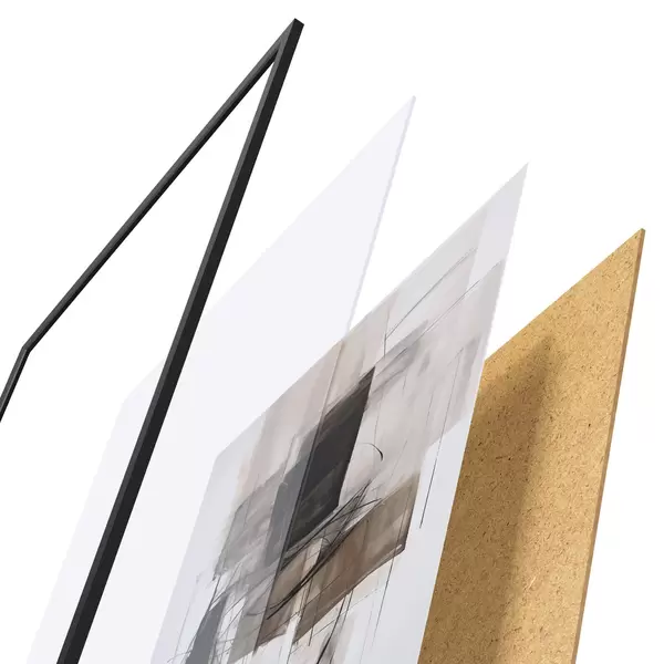 Das Poster besteht aus einem Rahmen, Plexiglas, einem gedruckten Bild und einer Rückwand aus Spanplatten. Dank der Halterungen auf der Rückseite kann das Poster sofort an die Wand gehängt werden.