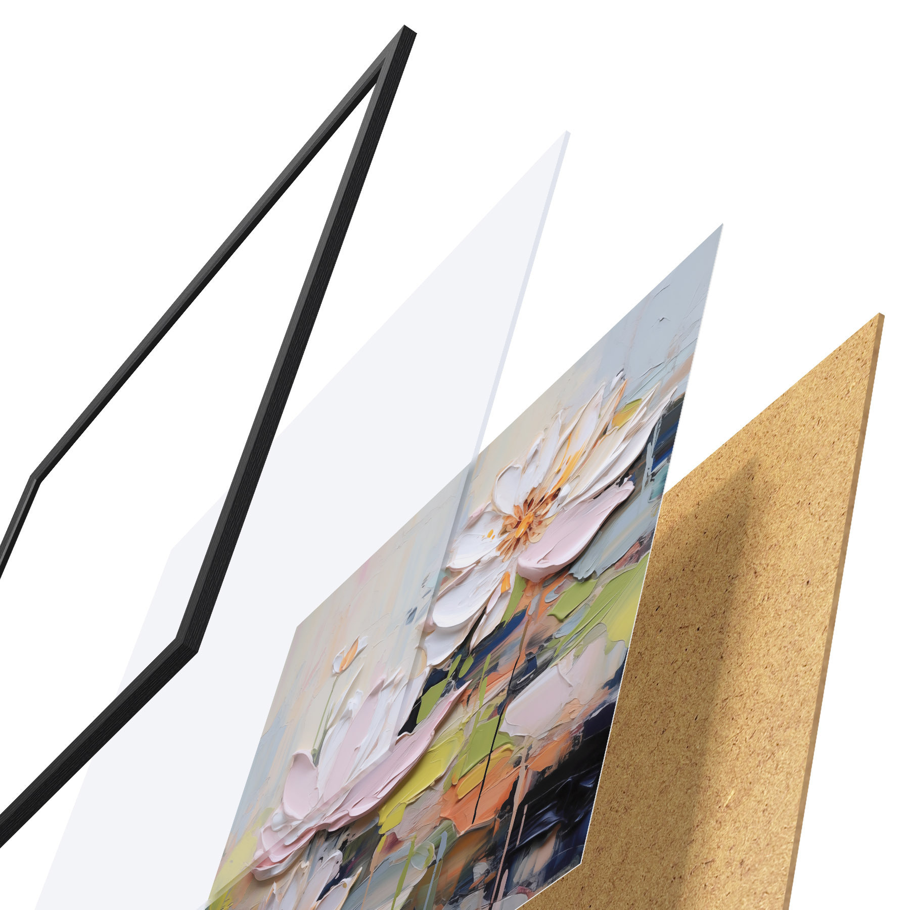 Das Poster besteht aus einem Rahmen, Plexiglas, einem gedruckten Bild und einer Rückwand aus Spanplatten. Dank der Halterungen auf der Rückseite kann das Poster sofort an die Wand gehängt werden.