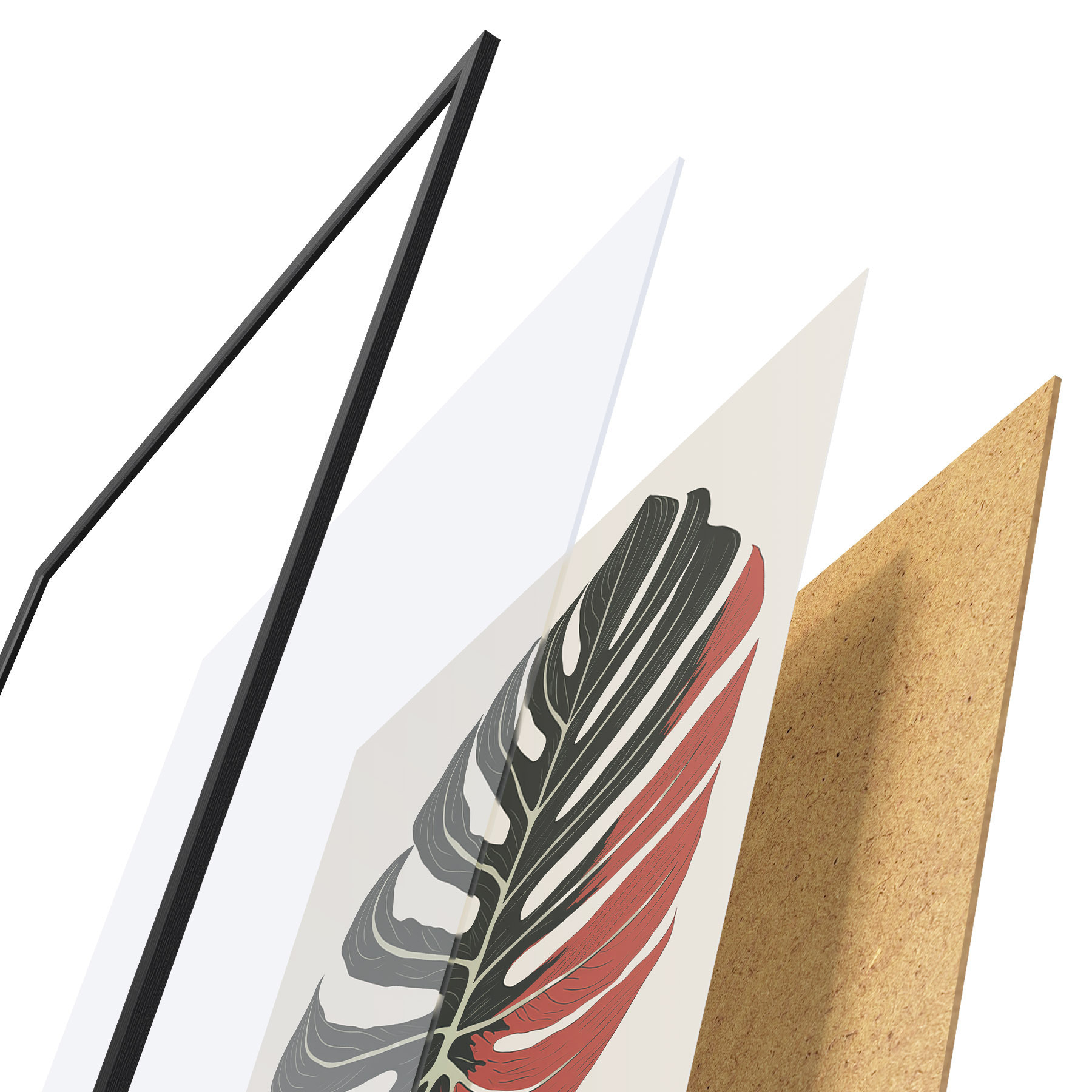 Das Poster besteht aus einem Rahmen, Plexiglas, einem gedruckten Bild und einer Rückwand aus Spanplatten. Dank der Halterungen auf der Rückseite kann das Poster sofort an die Wand gehängt werden.