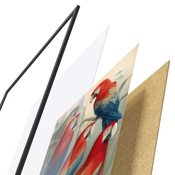 Das Poster besteht aus einem Rahmen, Plexiglas, einem gedruckten Bild und einer Rückwand aus Spanplatten. Dank der Halterungen auf der Rückseite kann das Poster sofort an die Wand gehängt werden.