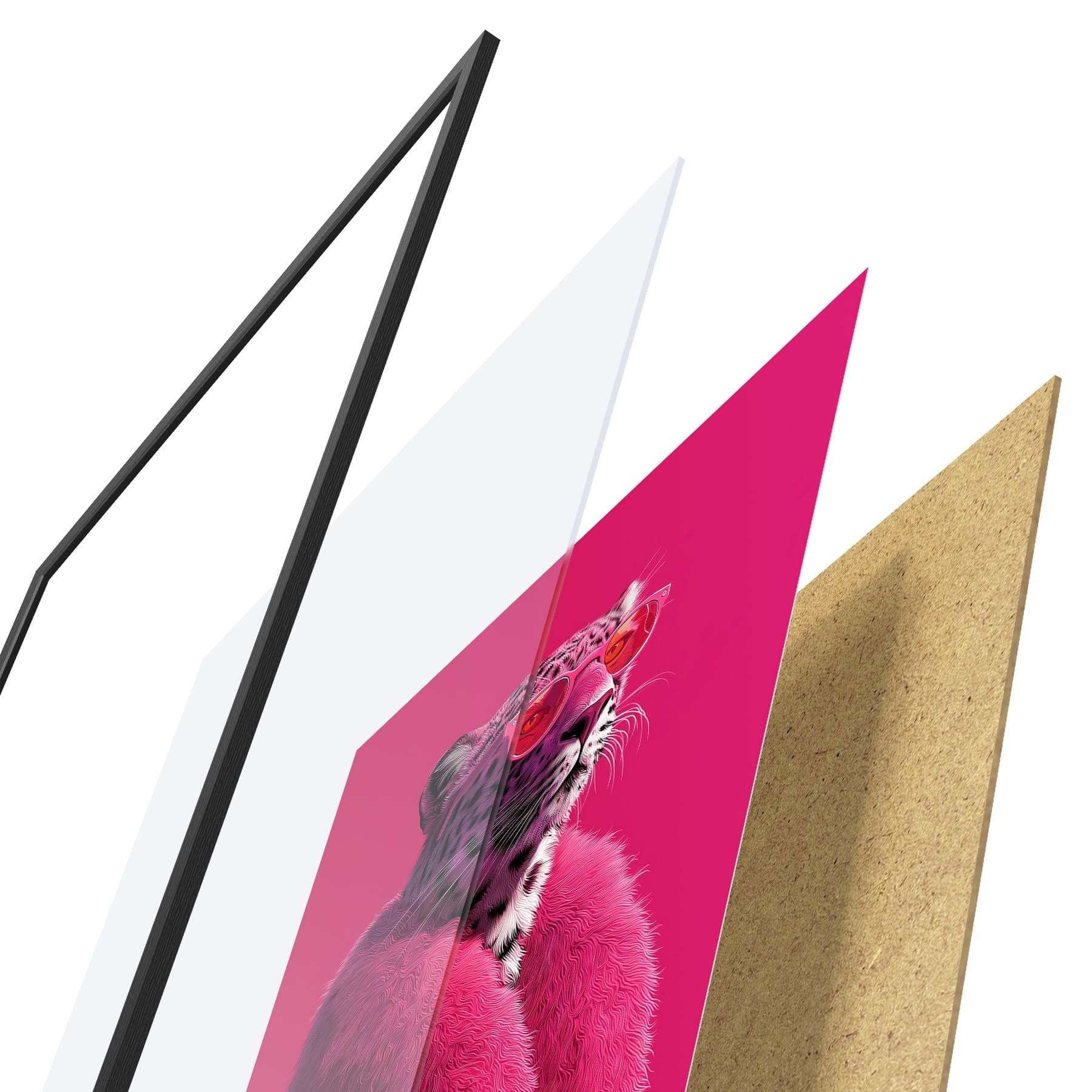 Das Poster besteht aus einem Rahmen, Plexiglas, einem gedruckten Bild und einer Rückwand aus Spanplatten. Dank der Halterungen auf der Rückseite kann das Poster sofort an die Wand gehängt werden.