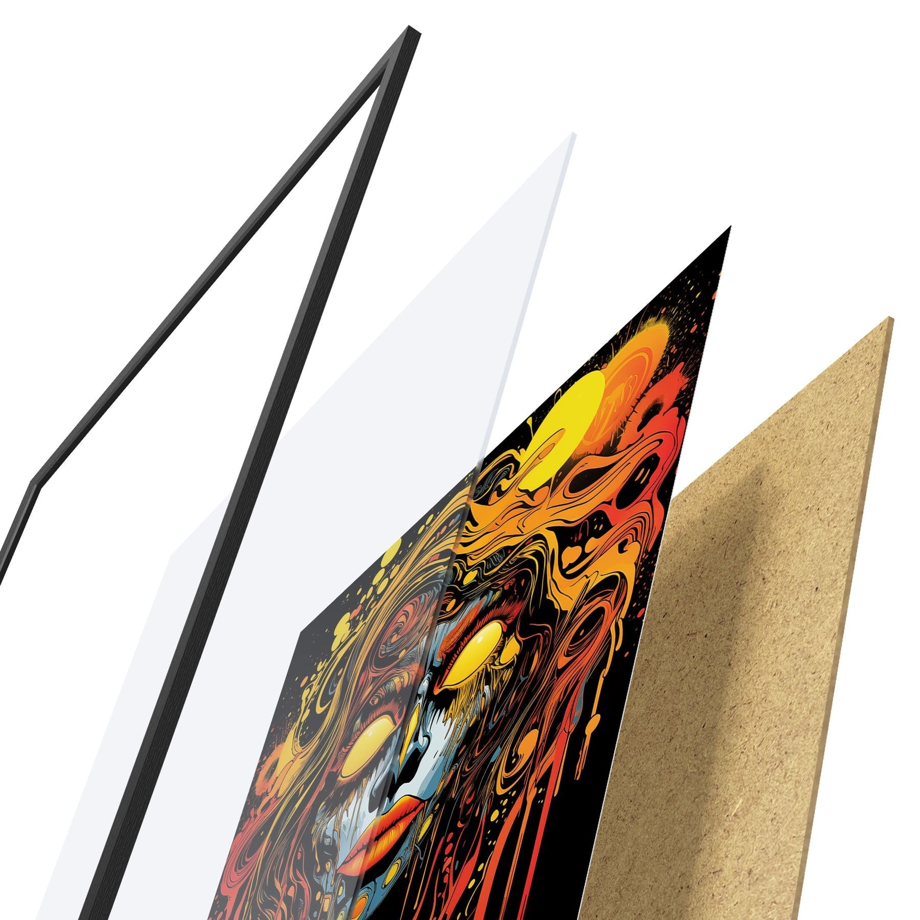 Das Poster besteht aus einem Rahmen, Plexiglas, einem gedruckten Bild und einer Rückwand aus Spanplatten. Dank der Halterungen auf der Rückseite kann das Poster sofort an die Wand gehängt werden.