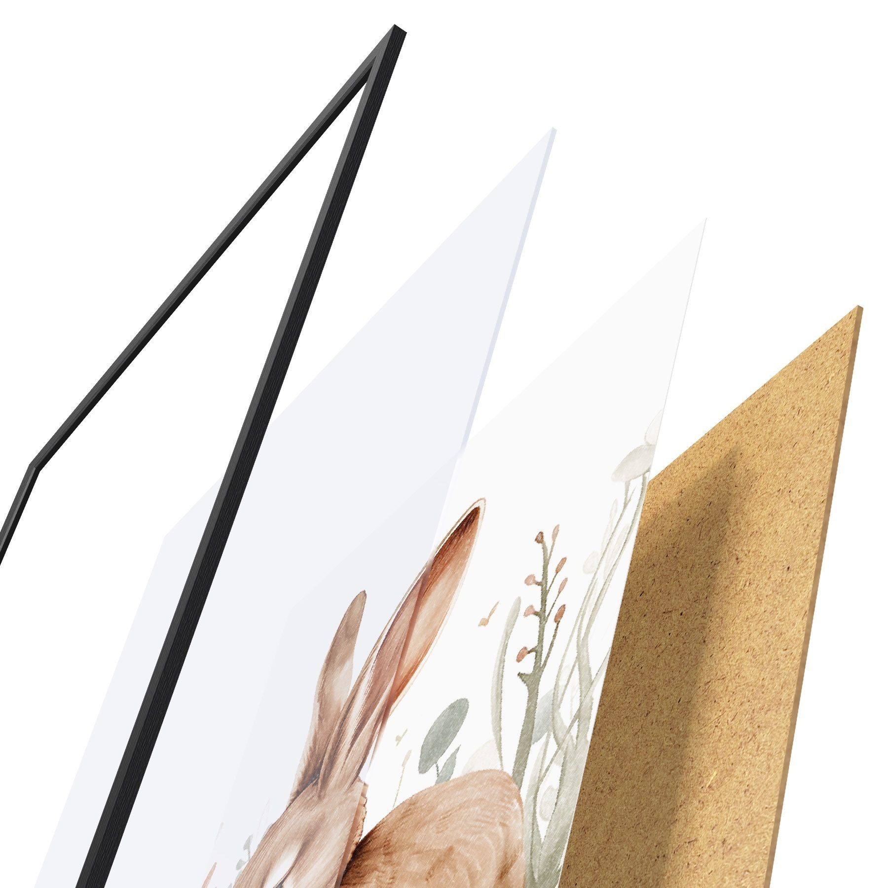 Das Poster besteht aus einem Rahmen, Plexiglas, einem gedruckten Bild und einer Rückwand aus Spanplatten. Dank der Halterungen auf der Rückseite kann das Poster sofort an die Wand gehängt werden.