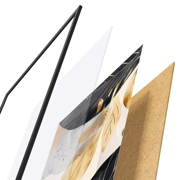 Das Poster besteht aus einem Rahmen, Plexiglas, einem gedruckten Bild und einer Rückwand aus Spanplatten. Dank der Halterungen auf der Rückseite kann das Poster sofort an die Wand gehängt werden.